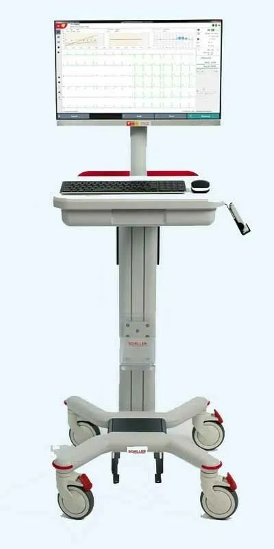 - Integrated workstation that allows reviewing all devices connected to the SCHILLER Server. Includes a PC unit, monitor, cart, and an acquisition module, either wireless (MS-12 blue) or wired (MS-12 USB).