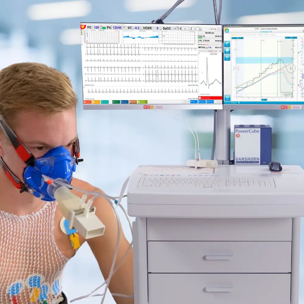 The CARDIOVIT CS-200 Office Ergospiro covers all essential applications of ergospirometry. It can perform pulmonary function tests, metabolic tests, and 12-lead stress ECGs, with the option to use a wired or wireless ECG amplifier.